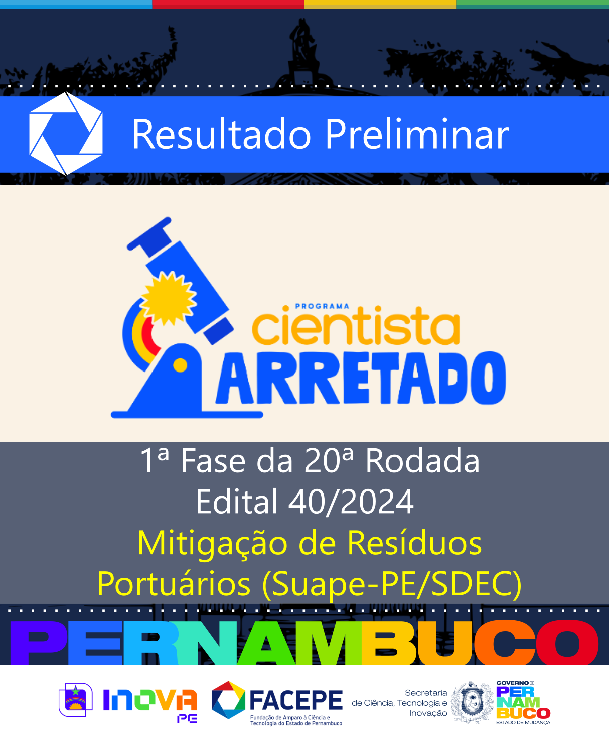 A Fundação de Amparo à Ciência e Tecnologia do Estado de Pernambuco (Facepe) torna público o resultado preliminar da 20° rodada do Programa Cientista Arretado, referente à 1ª fase da chamada aberta pelo Adendo nº09 ao Edital nº 40/2024. Com investimento de R$ 1,05 milhão, a 20° rodada contempla a temática Mitigação de Resíduos Portuários, com desafio proposto pelo Complexo Industrial Portuário Governador Eraldo Gueiros (Suape) vinculado à Secretaria de Desenvolvimento Econômico (SDEC-PE).
