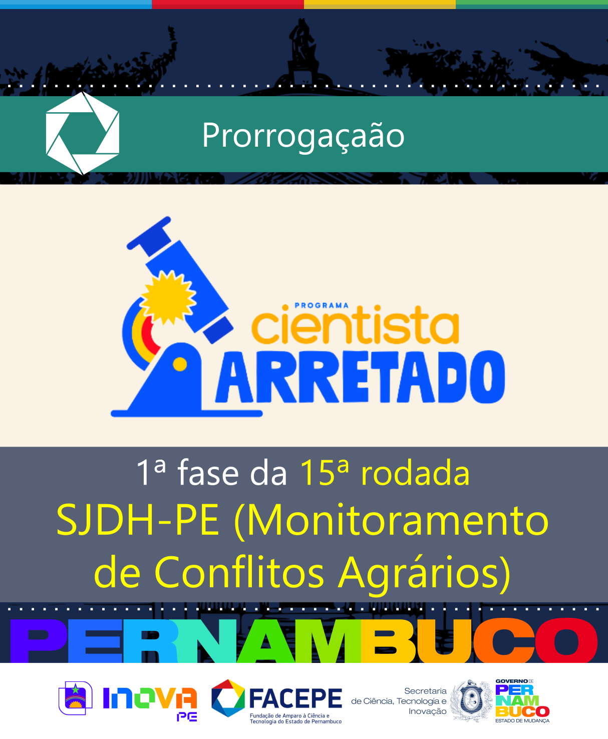 A Secretaria de Ciência, Tecnologia e Inovação do Estado de Pernambuco (Secti-PE) e a Fundação de Amparo à Ciência e Tecnologia do Estado de Pernambuco (Facepe) comunicam que a 1.ª fase da 15.ª rodada do Programa Cientista Arretado, aberta pelo Adendo nº 04 ao Edital nº 40/2024, tem o prazo de submissões prorrogado para o dia 14 de novembro de 2025, até as 23h59.